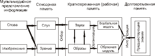 существование двух в общем независимых каналов обработки информации (вербального и невербального);ограниченный объем каждого из каналов в кратковременной памяти;обработка информации требует активной деятельности мозга по отбору, организации и интеграции информации в базу знаний.